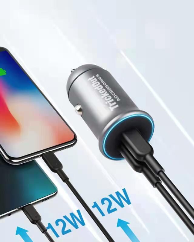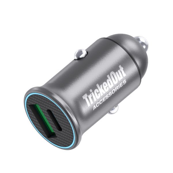 Fast charge at maximum speed with the new Tricked Out Accessories Dual Car Charger. This dual port car charger offers a rapid and efficient charge while on the go and can charge two devices simultaneously. Finished in a sleek gunmetal gray, this car charger is small enough for everyday use but provides enough power for a quick charge during travel.